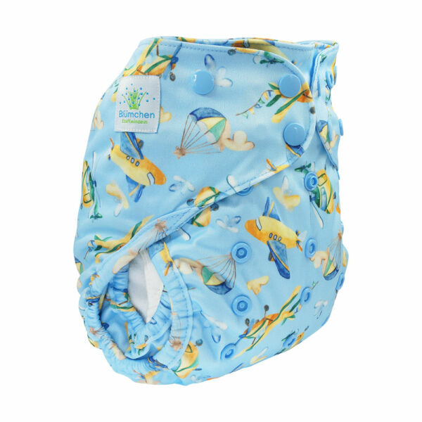 - Druckknopfverschluss – kann mit dem Snap-On Velco auch in eine Klettversion verwandelt werden (Achtung: das Snap-On Velcro wurde ursprünglich für eine andere Überhose entworfen, daher bleibt der dritte Drucknopf (untere Reihe) von Blümchen ohne Klett und muss weiterhin als solcher geschlossen werden/oder man lässt ihn offen)